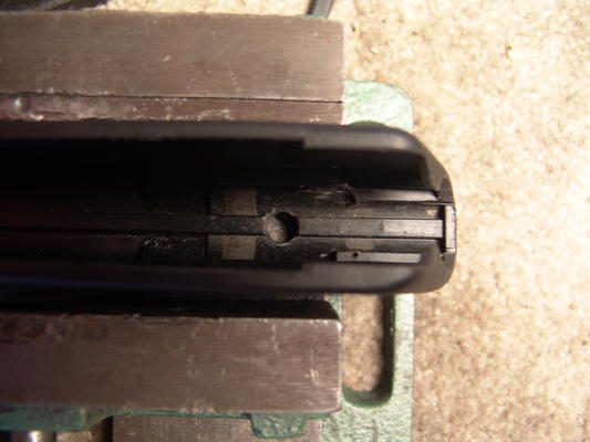 Both internal rails have been milled down to fit the mounting plate. The plate has been positioned, with the protrusion going through the existing sling hole in the foreend