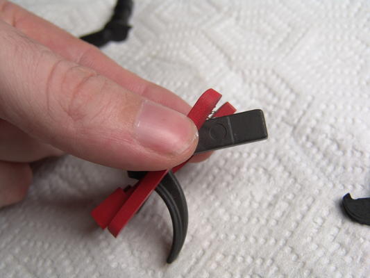 First off, this is what the receiver rug really looks like. Most commercial websites use the side view only, which doesn't give you a chance to figure out how it works, so here you go. On an unrelated note, in color it looks very much like the DPMS Accu-Wedge, which I've also written a how-to on installing. The finish is less glossy, however - I'm not sure what difference this makes. Mounted to a trigger, it looks more like this. Notice the slits for the trigger return spring? That coverage is what tends to prevent debris from getting underneath the front part of your trigger, which will jam it in the cocked position and leave it unable to fire. And the two longer "ears" that fit on either side of the long rear part of the trigger? Those keep debris from getting underneath the rear part and jamming the trigger in the rearmost position. The rear ears are also where the tightest fit is found. I strongly suspect that most of the change in trigger pull comes from back here. Notice the scooped-out contours directly underneath where the pivot pins rest? I suspect that in the first-generation rug (which didn't have those), the trigger pull was a bit stiffer.