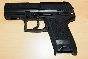 The first stage of field stripping the USP: press the slide backwards until the notch on the lower part of the slide (just below and left of the 'AK' engraved on the slide in the picture) is right above the center of the slide release lever.