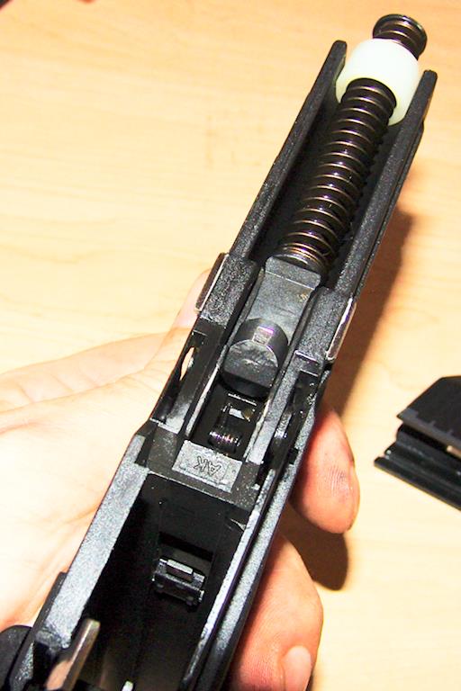 Push the slide forward, off of the frame. Notice that while the frame itself is polymer, the slide makes contact with metal protrusions embedded in the sides of the polymer frame. Those provide contact points between frame and slide, thus reducing metal-on-polymer abrasion as the weapon cycles. This is the slide, shown from below. The spring you see is the recoil assembly, which locks together with the barrel. Removing the barrel from the slide. Note the slot towards the rear of the barrel, which interlocks into a machined piece at the rear of the recoil spring assembly. The USP, still field stripped but with the new magazine release installed. Note how the barrel, above, interlocks with the guide rod assembly.The USP is now field stripped. Reassembly is simply a matter of reversing the assembly steps. While it's apart, you may find the points below to be noteworthy. Interesting Points on the USP The recoil spring assembly slides into a notch on the frame down below, and is thus captured within a channel on the frame. This is an interesting contrast with the CZ and Sig pistols I've seen. Less remarkable is the plastic buffer.-- SeanNewton - 03 Sep 2012 |