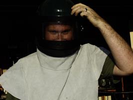 The compressor doesn't do any good if there's no way to get the air to you. I use either a Nova 2000 full helmet (depicted) or an Allegro half-mask system. The half-mask draws little enough air that two can breathe with it, while the Nova is strictly for one-respirator use. The Nova 2000 is a heavy-duty helmet which will keep contaminants away from pretty much everywhere. The attached tunic is leather, which provides protection from flying fragments, etc.